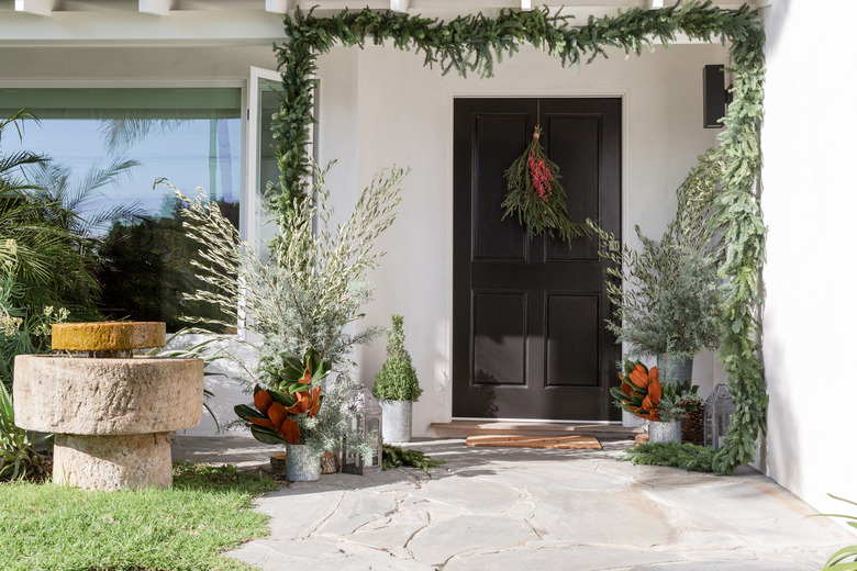 Share your Christmas spirit with the neighborhood by devoting time and energy to your home's exterior holiday decor and make a cheerful first impression. An evergreen wreath is a standard door flourish, but did you know they're available in a variety of materials from aluminum cans (truly) to flowers? String lights look beautiful wrapped around tree trunks, while garland draped above the door or on porches adds dimension. Consider lining a walkway with candlelit lanterns or hanging Christmas swag on outdoor sconces — there are endless exterior ideas that exude that festive feeling.