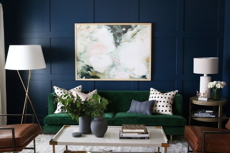 Blues and greens never fail to please and the bolder you go, the more of an impact the color pairing will make. In this formal sitting room by Studio McGee, the emerald green sofa acts as the perfect supporting cast for the navy board and batten accent wall. The framed piece of abstract art ties the whole look together.