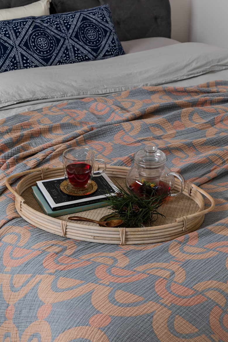 Bring a bit more intention to your nighttime tea time by creating a setup — your tea, your reading material, etc. — that you can transport on tray that will actually look just as lovely on the floor when you've finished.
