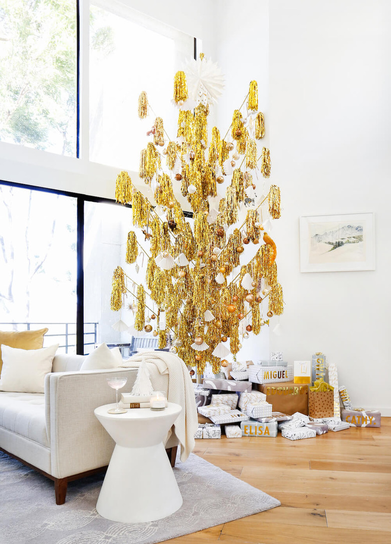 If you're one of those people who likes to go big when it comes to holiday decor, this over-the-top gold pompom tree from Orlando Soria's condo may inspire you. Believe it or not, gold can be a neutral shade that works in a lot of rooms. And if you have a high enough ceiling, why not go as big as you can? No water needed.