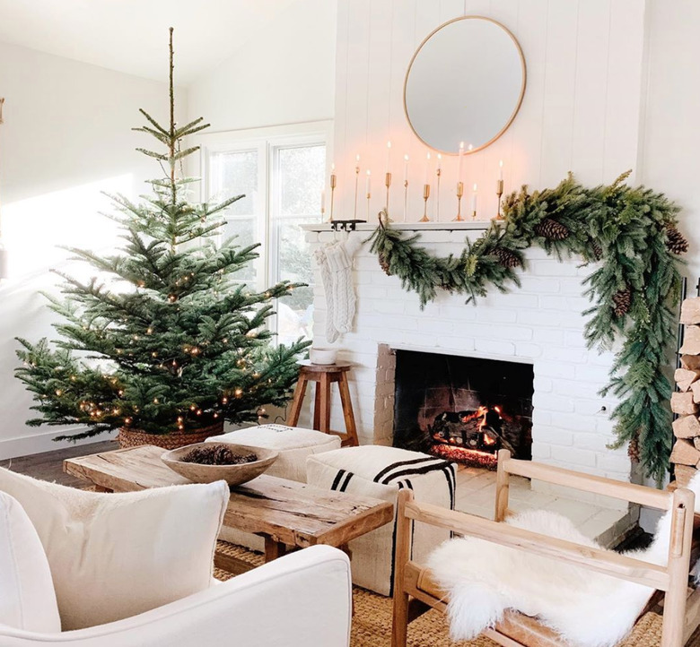There's nothing like the scent of pine inside your home during the holidays. If you have a neutral room like this one, a simple green tree and garland with clear lights is really all you need to keep it real and festive.