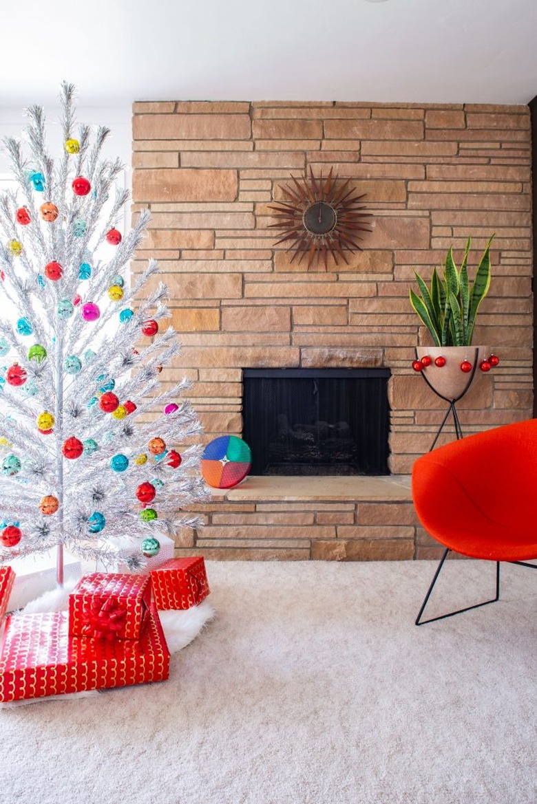 If fun hues are your thing, this retro tree idea from Atomic Ranch will really get you in the holiday spirit. The silver tinsel branches of this vintage tree have pops of primary colors that make us want to sip a classic martini while spinning some Christmas carols on vinyl.