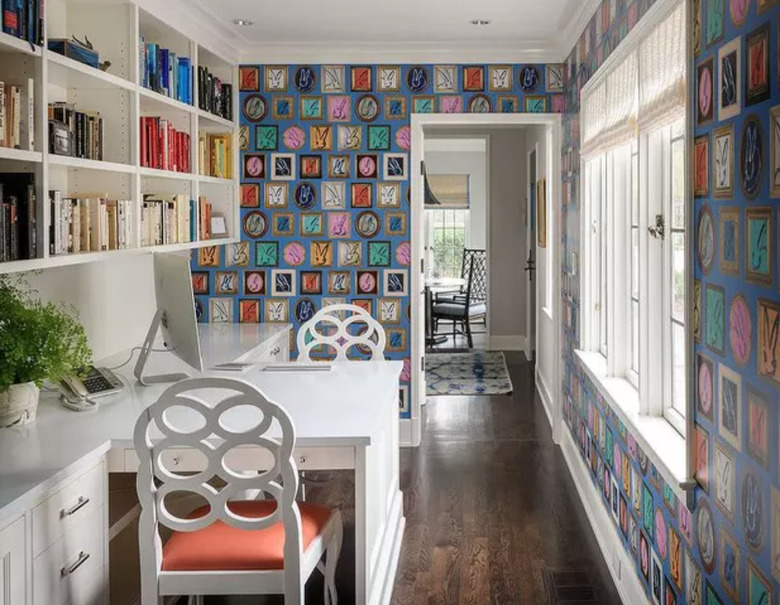 Sure, you might spend a ton of time in your sweats and on Slack while working from home, but that doesn't mean your home office has to slack on style. Keep the mood fun with some chic wallpaper and color-coded bookshelves like Massucco Warner did in this room. And if your desks face one another, make sure there's enough room to comfortably fit two monitors. It may even spark a little collaboration.