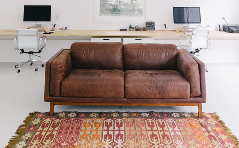 Install a long and deep shelf that can serve as a desk, so two people can have spacious work stations. This look, from The Fresh Exchange, even has enough room for kids to do homework and crafts. Plus, the leather couch is the perfect place to take some much needed screen breaks.