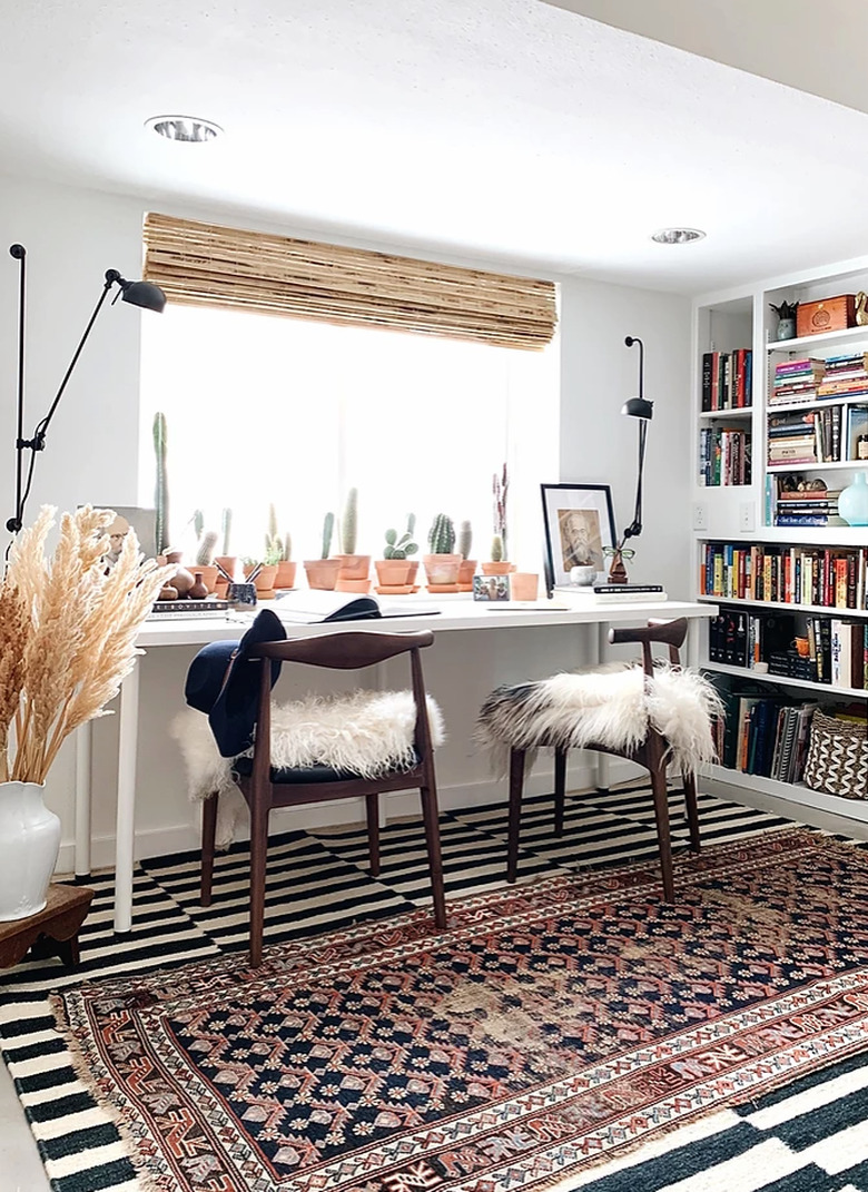 Close quarters might mean that your home office for two consists of only one desk and a pair of chairs. But that's okay. If you have a window, point the desk towards it, add some plants, and you've got a cheery view to appreciate. We love this eclectic, desert vibe office from Undecorated Home. The cacti-filled windowsill makes co-working feel creative.