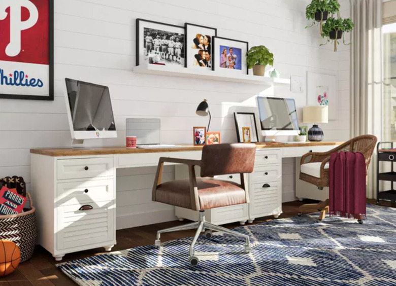 Side-by-side traditional desks are always smart, and they can take up less room if they're on the shallow side. We like how this classic space still feels like fun with shiplap walls and eclectic art.