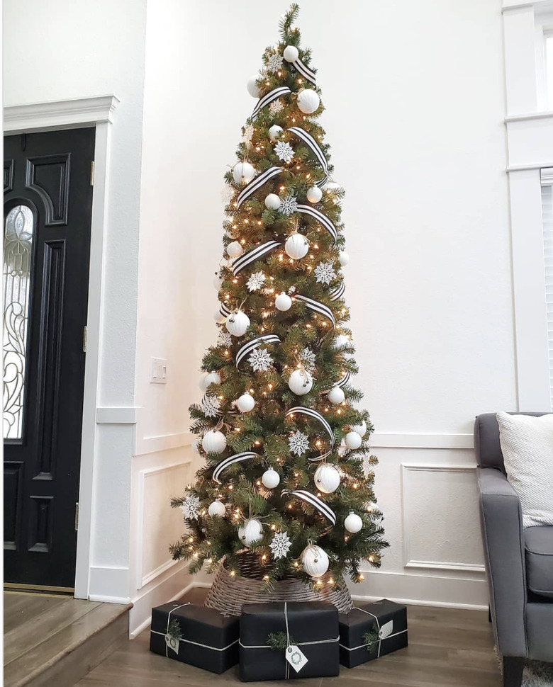 A large white tree decorated with cool-toned ornaments can tie together a coastal living room but still feel really festive. We love the light and breezy look of this white pine by Making Home Base — it's anything but traditional.