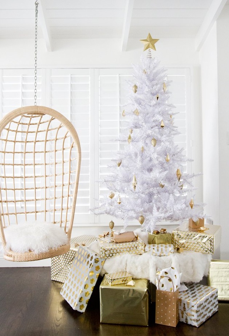 Keep things simple with your white Christmas tree — let it complement your home's neutral palette. Add some gold ornaments and accents, and keep your gift wrap in the same tones like Sarah Sherman Samuel did in this holiday setup.