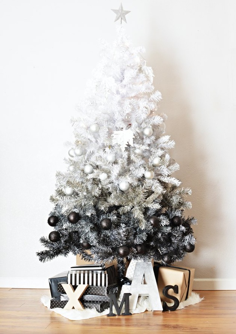You can take a green artificial tree, and use spray paint to create an ombre effect like Angie from Little Inspiration did. Keep white as your predominant hue, then accent the bottom with a darker contrast color. Who knew a Christmas tree could be an awesome DIY project?