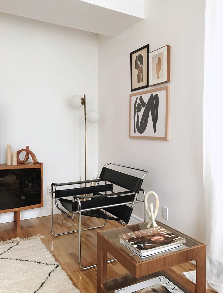 In addition to the classic cantilever chair, Breuer was also inspired to create another iconic piece of tubular steel furniture. Surprisingly, the idea struck while he was riding his bicycle. The Wassily chair turns the concept of a traditional overstuffed club chair on its head. Instead, it's thin and wiry. This version of the piece, in Elif Filyos' home, features a dark leather seat and looks beautiful against the white walls and minimal decor.