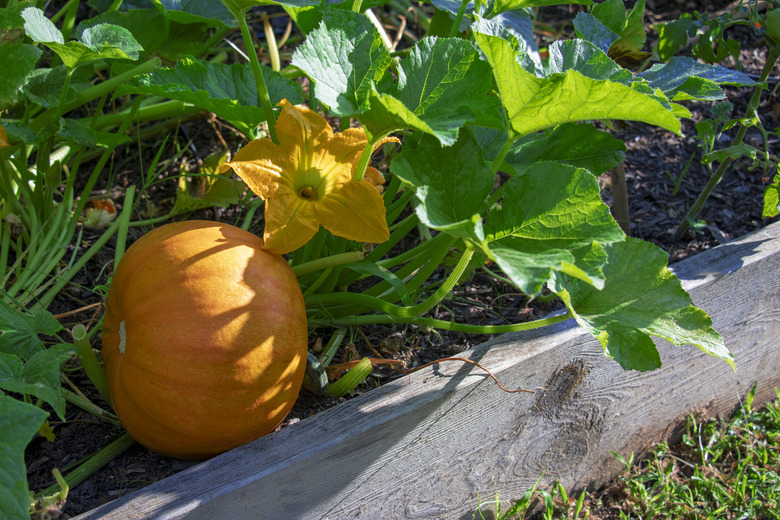 Pumpkins are referred to by many as "hungry" plants. This means they require a lot of nourishment to grow well, which means healthy, fertile soil and a lot of water. Aim for an inch or so of water weekly and don't be fooled by dry-looking vines. That's a normal part of the growth cycle, and it can trick home gardeners into overwatering, which can cause rot. Mulch helps to cut down on weeds and to hold in moisture. Fertilize on a regular schedule, such as weekly or every two weeks, to make sure the pumpkins are well-nourished.