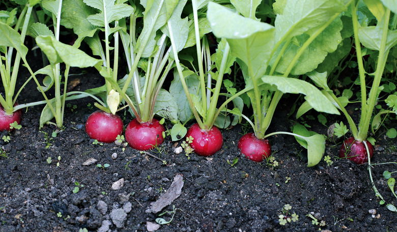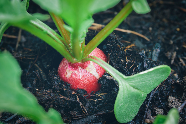 Radishes need loose earth to grow properly, so work your soil with a tiller to a depth of 12 inches deep before planting. Make sure your soil is rich in potassium and phosphorous. Because they grow so quickly, it's best to work fertilizer into your soil before planting radishes. Choose a fertilizer low in nitrogen but high in potassium and phosphorous – too much nitrogen will cause your radishes to grow more leaves rather than roots, and too little phosphorus can negatively impact the taste of your crop.