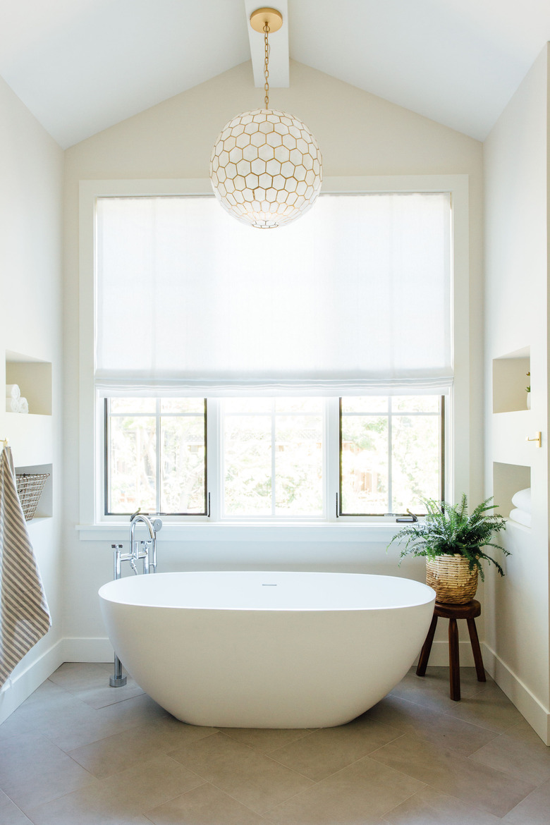 We're relaxed just looking at this elegant contemporary bathroom from Michelle Lisac Interior Design. The white window treatment both filters light and provides privacy, which is a must for nighttime bubble baths with a good book. And the barely-there shade allows the bathroom's standout pieces — the sleek tub and art deco light fixture — to be the stars of the room.