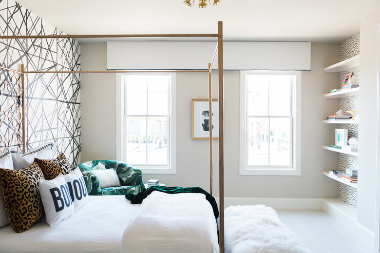 Forget your grandmother's dusty floral valance. The traditional addition can actually be quite contemporary — just look at the one in this bedroom by Studio Ten 25. The white design with black trim both complements the lively, patterned wallpaper while exaggerating the ceiling height and adding a classy cover to the simple shades below.