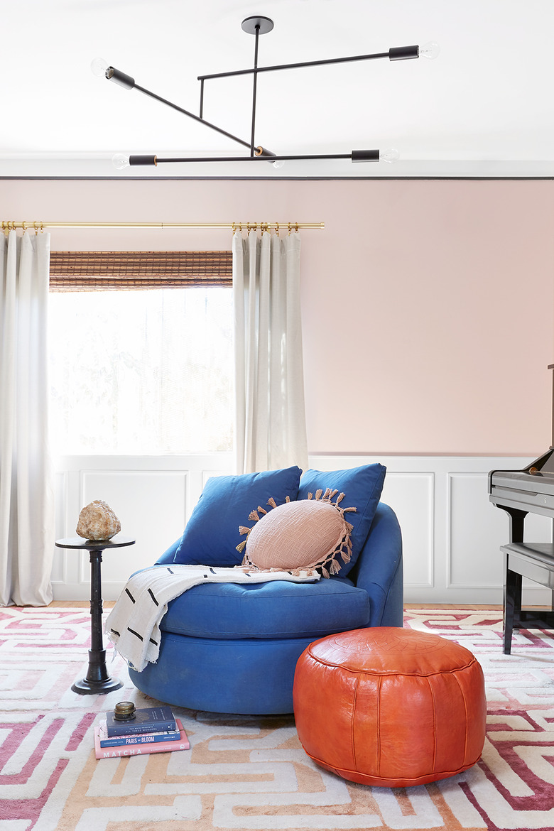 Mary Patton of Mary Patton Design didn't shy away from texture, pattern, or color in this pretty pink dining room. Instead of choosing drapes that blend into the background, Patton went bold with an emerald pair that add another element of color and fun to the contemporary bohemian space. This room — which would be perfect for homemade meals or takeout — is an experiment in scale, from an oversize light fixture to large art to attention-grabbing drapes. Yet everything feels balanced and beautiful.