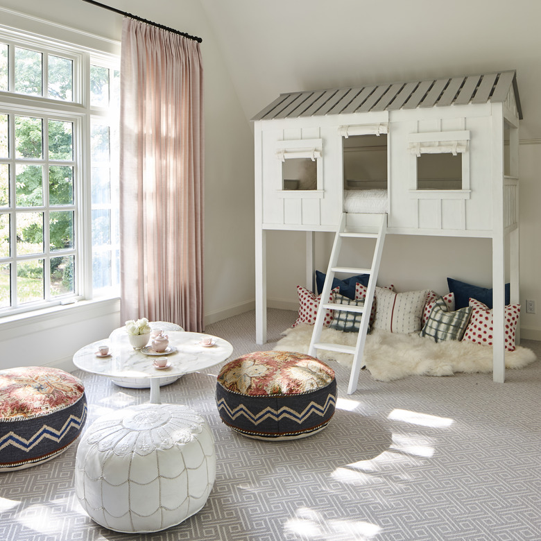 To keep the harsh sun out of your little one's eyes during an afternoon tea party, think contemporary window treatments that are light, bright, and breezy. These floor-to-ceiling, dusty pink drapes bring height and color to an otherwise minimal playroom design by Mel Bean Interiors. When you're focused on filtering light, as opposed to privacy, go for a semi-sheer option.