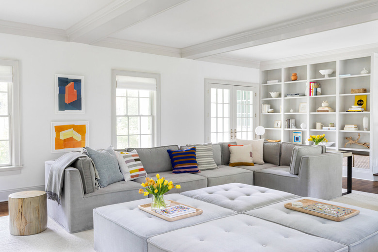 If you're averse to color, you can use it sparingly and in measured amounts to add a bit of personality to neutral spaces. Chango & Co. punctuated a soothing monochromatic living room with subtle doses of secondary colored accents including orange artwork and orange, yellow, and green flower arrangements.