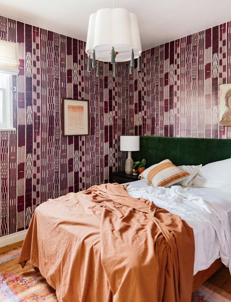 Combine all three secondary colors for an unexpectedly elevated look loaded with fall vibes. This bedroom by color master Dabito features a tone on tone purple wallpaper, emerald green headboard, and muted orange bedspread, while crisp white accents — sheets, ceiling, and pendant light — break up the design and keep it from being visually overwhelming.