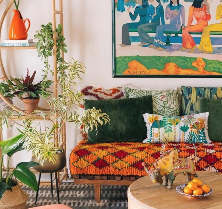 Avoid cliche Halloween vibes when combining secondary colors by pairing saturated orange with mossy green, as Justina Blakeney does in this casual and eclectic living room. She injects plenty of other hues, prints, and textures for an energetic space that's full of life.