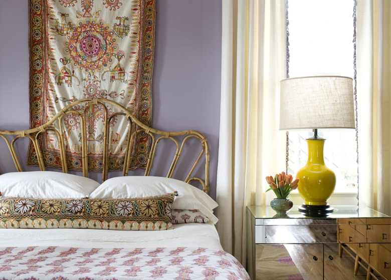 According to color theory, calming "cool" colors — blues, greens, and purples — should be used in rooms (such as bedrooms) where relaxation is a priority. Angie Hranowsky gave this refuge the cool color treatment by coating the walls a pale periwinkle, which tempers a bold canary yellow lamp. A rattan bed, patterned textiles, and a mirrored end table lend both boho and sophisticated touches.