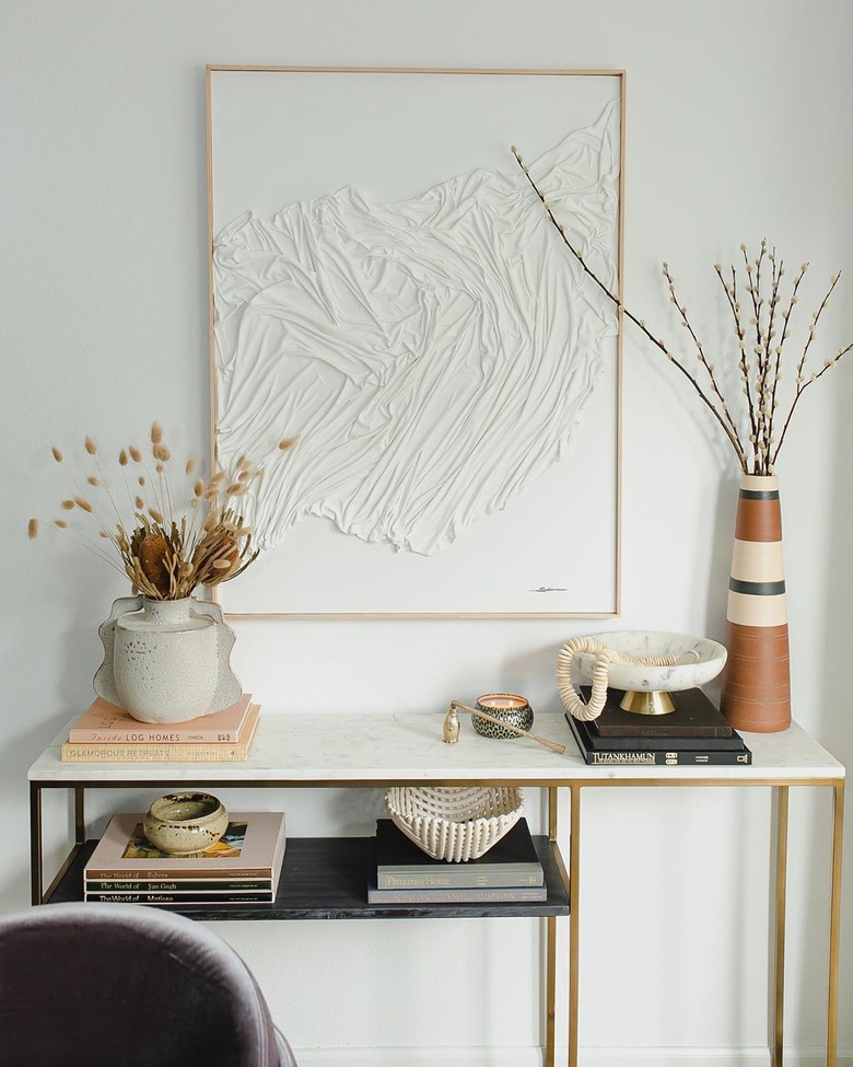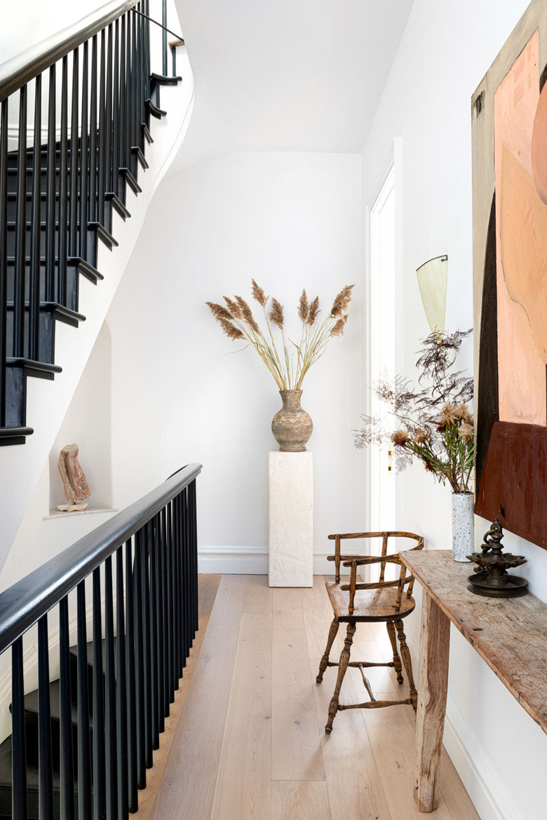 Looking for a way to add height to to an otherwise simple space? Bring in some fall florals with super long stems. We love the fluffy pampas grass that Athena Calderone added to her hallway. But beyond just looking interesting, they take up vertical space without feeling overwhelming. Grab a vintage vase and pedestal, and pop your arrangement right in. A dried situation, in particular, would last throughout multiple seasons.