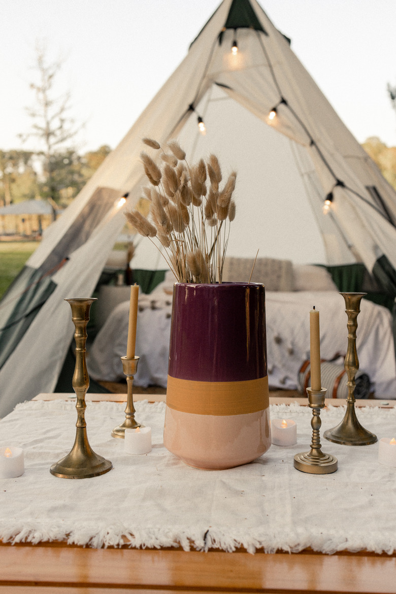 No, you don't want to put candles directly into your bouquet. But take a page from Erin of Francois et Moi's book and incorporate them in your tablescape. The height of the white tapers creates a fun balance between the shorter arangement and gives her Friendsgiving table an inviting glow. Erin chose warm pink, peach, and white flowers for this look. And we can't help but applaud the color choice.