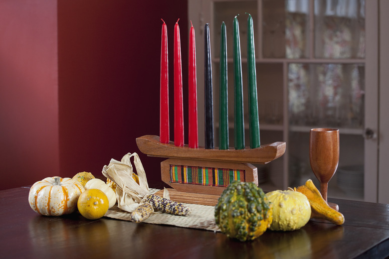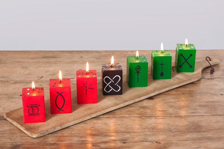 The seven principles of Kwanzaa, or Nguzo Saba, are represented by the candles on the kinara, and on the first night, on December 26th, the centermost Umoja, or "unity" candle is lit. On its left you'll find three green tapers, which signify; Kujichagulia (self-determination), Ujamaa (cooperative economics), and Kuumba (creativity), while on the right are three red candles representing: Nia (purpose), Ujima (collective work and responsibility), and Imani (faith). They are lit center first then left to right, culminating with a feast called karamu on January 1st.