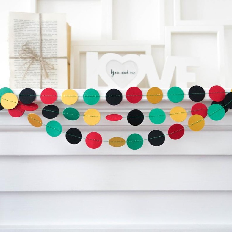 For a whimsical spin on Kwanzaa decorations, buy or DIY a festive garland composed of traditional hues for the holiday — think green, red, black, and yellow — and string it along the mantel or above the windows. If you're making your own, switch things up by using vibrant pom poms or wooden beads, in lieu of paper, for a texturally-rich finish.