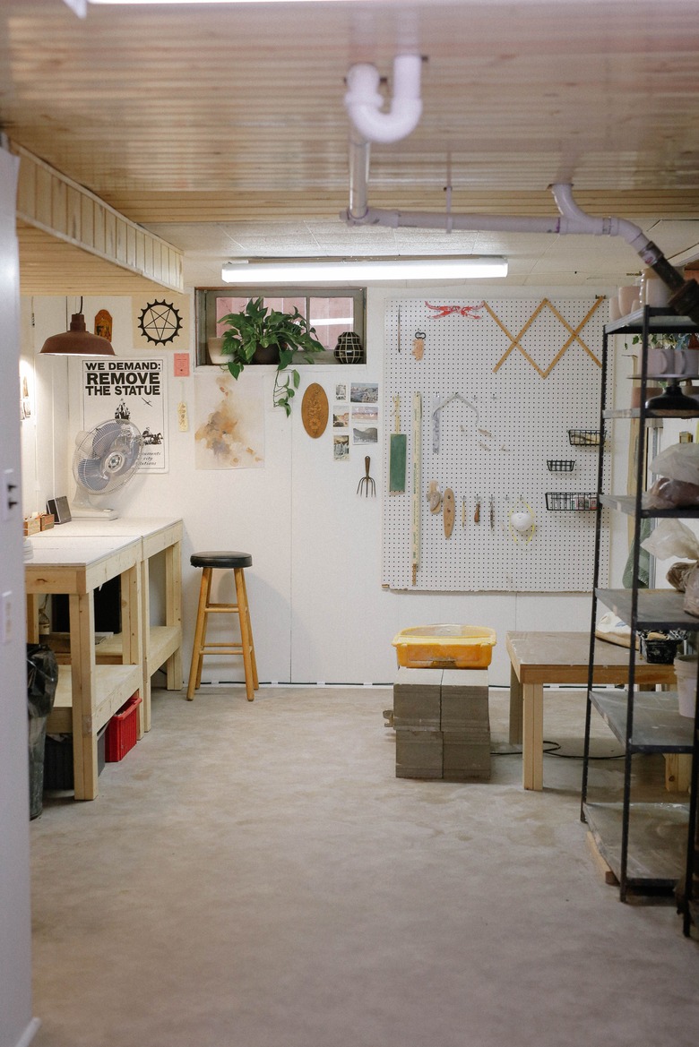 For an unfinished basement that happens to be a little rough around the edges, clutter can make it seem a lot more so. Double down on organizational systems such as rolling racks and open-shelving to keep storage in check. We're all for Nikki Norberg's basement-turned-studio, which includes a wall-mounted pegboard and tabletops with shelving to keep her workspace tidy.