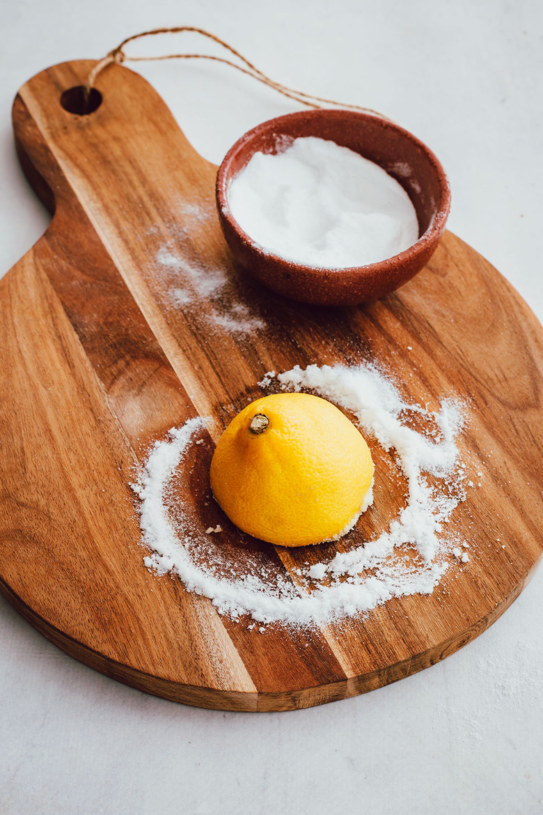 The acidic power of lemons combined with scrubbing power of salt is the perfect way to remove stuck on food, kill odors, and fade away stains. Sprinkle a little kosher salt on the cutting board and give it a thorough scrub with half of a lemon to get into all the cracks to disinfect.