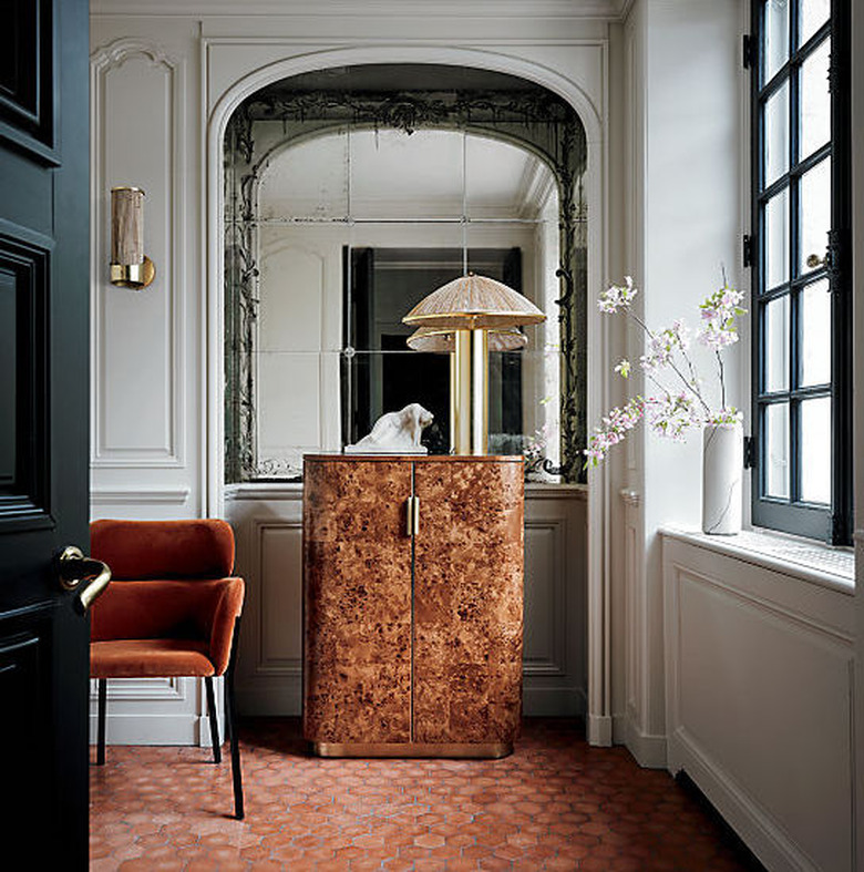 Art deco design includes jewel and metallic tones, geometric shapes, and luxurious woods. In terms of Hollywood Regency, it's similar to art deco, but manifests in more playful elements like rich textures, showy chandeliers, and lush fabrics. As you can imagine, both design styles would only be enhanced by a wood as special as burl.