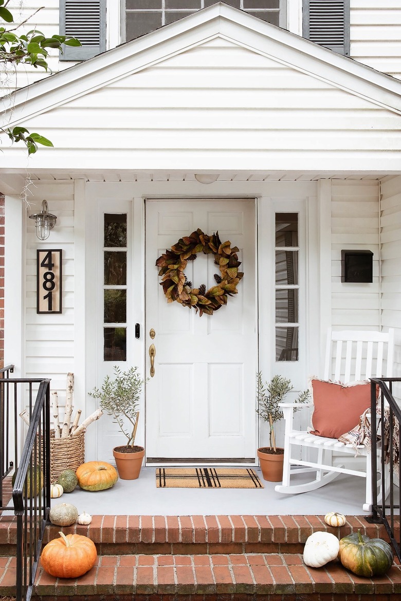 Now for the final touches! To create a welcoming entrance, we hung a beautiful faux magnolia wreath that'll last you all season (and many more after that). Instead of merely stacking firewood on your porch, consider a more stylish storage solution such as a basket with leather handles. To echo the pattern of the throw blanket, we chose a doormat in a similar plaid pattern, and planted a pair of small olive trees in terra cotta pots for a bit of greenery.
