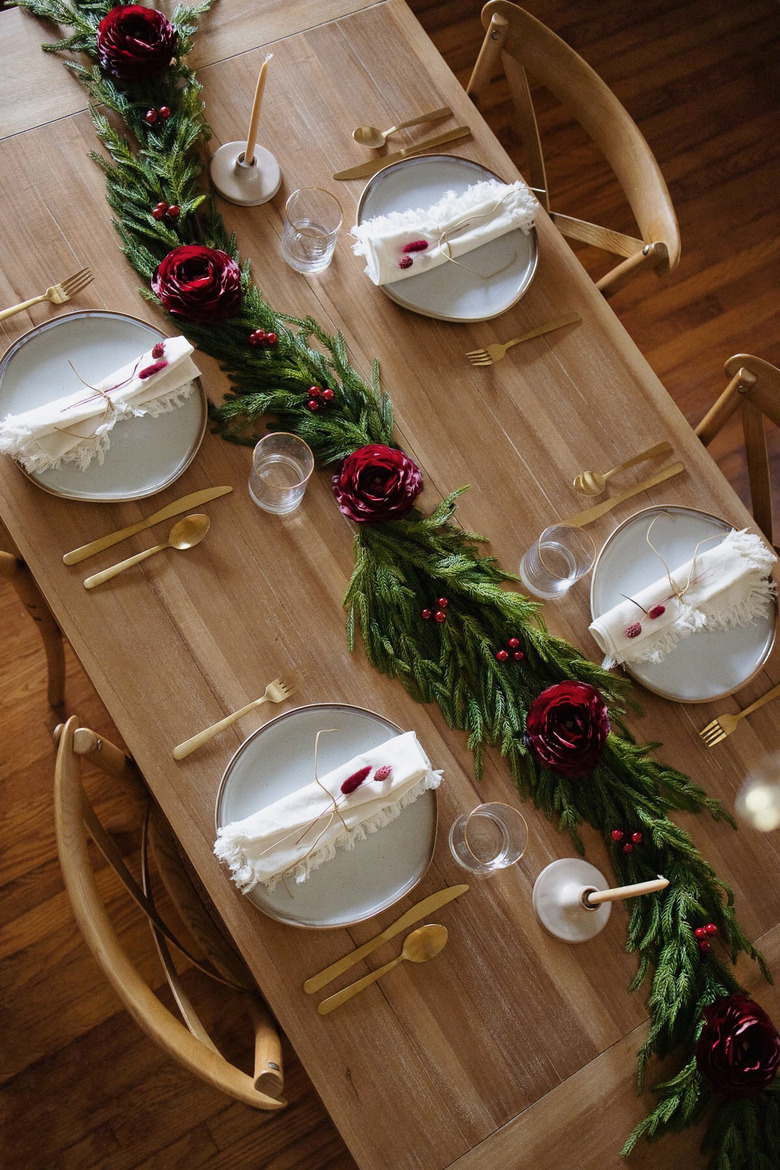 Set the rest of the table with flatware and glassware, tuck a few taper candles along the garland, and enjoy a very festive holiday meal!