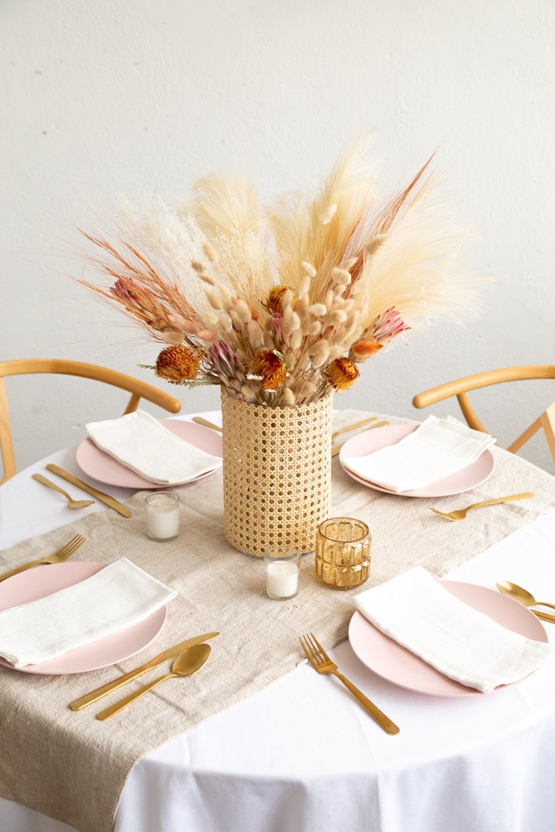 1. Make your own cane vase featuring dried protea blooms, dryandra, and pampas grass.