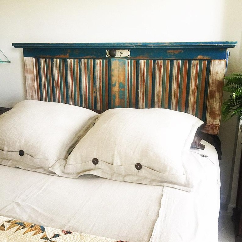 You probably saw this one coming, but likely not executed in such an imaginative, colorful manner. Touch of Gray Redesign hand-painted this louvered door. Are you up to the challenge? And why stop at the headboard — imagine using two doors and making a full bed frame. Kitchen Fun with My 3 Sons took wood doors with glass panels and created one in turquoise.