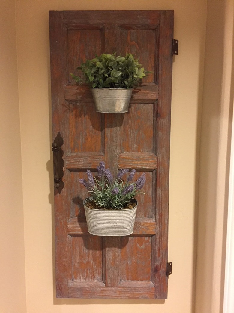 Reclaimed doors can also pair nicely with plants for inside or outside of the house. The Metal Edge Artisan grey-washed a cabinet door and added two galvanized planters using faux flowers. For a more colorful vertical garden, choose a bright-colored paint for the door or add flower pots of different colors or patterns, with equally cheery plants.