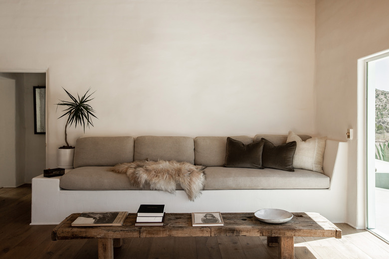 A traditional adobe built-in banco sofa was installed in the living room and topped with Loro Piana linen cushions and luxe cashmere throw pillows. The coffee table is an antique French work table from Galerie Half that was repurposed.