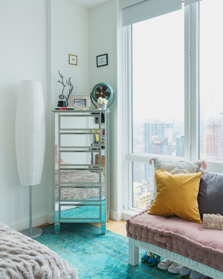 Unsure about where to place a particularly tall piece of bedroom furniture? Molly Torres Portnof of DATE Interiors suggests employing it in a corner. "For smaller rooms or areas, corners should be emphasized, not ignored," she says. "I like to place taller storage pieces, like a dresser for a bedroom or a cabinet for an office, in corners to bring the eye up."