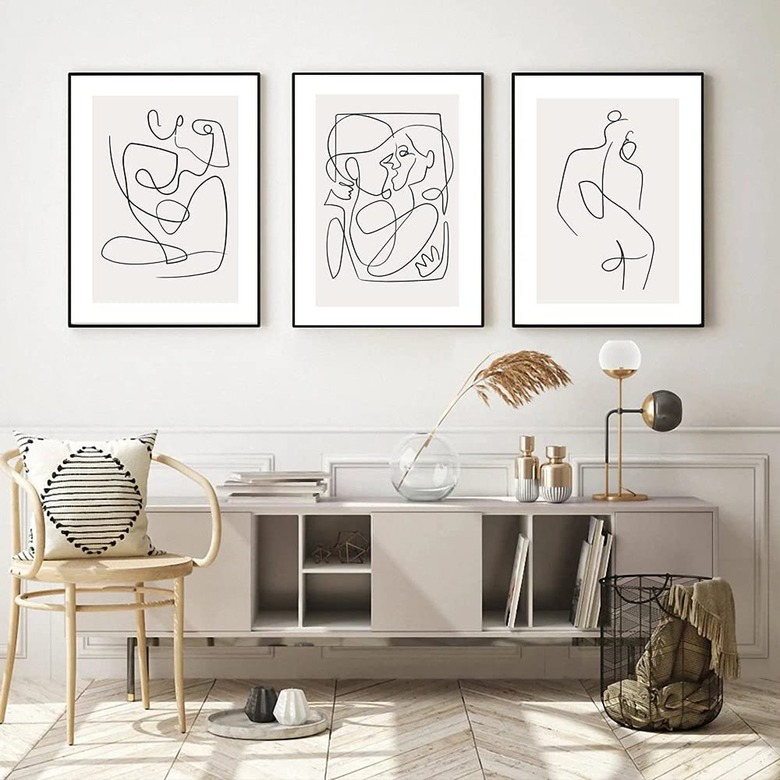 Michelle Zacks says a little line-work can go a long way on the wall above your bed. "An asymmetrical gallery wall arrangement composed of geometric artwork makes a graphic statement," she explains. "Use textural throw pillows and clean-lined wall sconces to play up the theme."