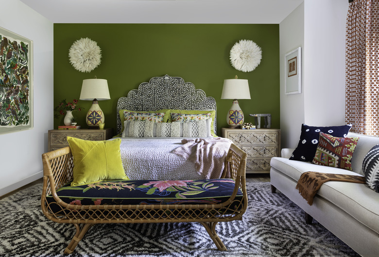 Not a fan of wallpaper? No worries. Emily Spanos of Emily June Designs says painting the wall behind your bed in a vibrant shade will also make a major impact. "Bright paint immediately creates visual interest, and if it's a punchy enough color, you won't even need art," she says.