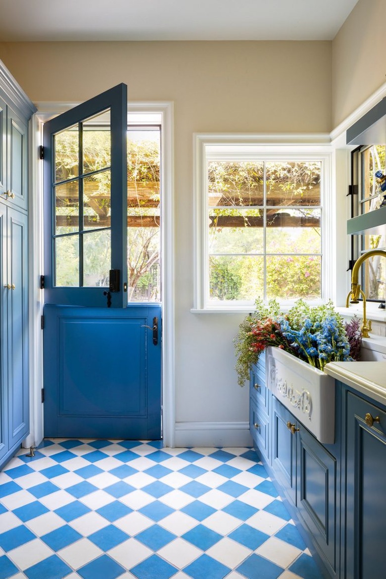 With their out-of-the-way location, mudrooms are the ideal spot to push boundaries with color and try something unexpected. Lori Clarke Design selected a soothing cornflower blue and white palette and then layered sophisticated European flair with a Dutch door, checkerboard floor, and an embossed oversize porcelain sink.