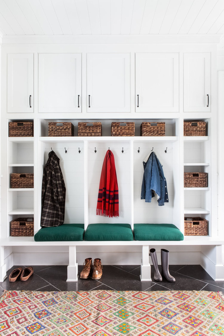 Make mudroom storage easily accessible (and attractive) for youngsters with the help of open cubbies, dedicated baskets, reachable hooks, and a requisite low perch for shoe removal. White built-ins set the stage for this organization hub by Chango & Co. while a slate floor and eclectic rug add texture and contrast.
