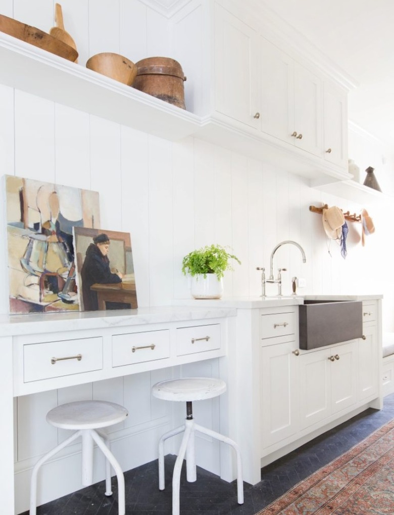Take notes from Amber Lewis and design comprehensive mudroom storage that includes a combination of open shelving to display your fave tchotchkes, as well as closed storage to hide unsightly, yet necessary evils such as cleaning supplies and laundry detergent. She infused country vibes with a soapstone farmhouse sink, tongue and groove wall paneling, and a pair of milking stools.