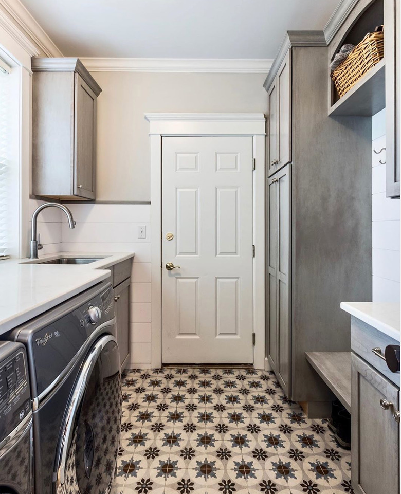 Maximize space and efficiency by combining your laundry and mudroom needs, as The Coveted Kitchen did in this stylish and compact space. A variety of storage and organization ideas including closed cabinets, drawers, and bins ensure that there's a designated spot for all of your belongings. Complete the look with eye-catching cement floor tile to add pattern and dimension.