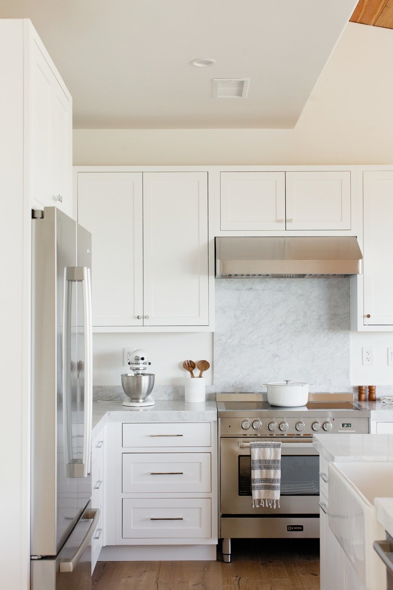 For all-white kitchens, a bold stove vent can be a bit much. But not here. This one is cleverly tucked away behind Shaker cabinets that match the rest of the cooking space, which lets the gorgeous marble backsplash take center stage.
