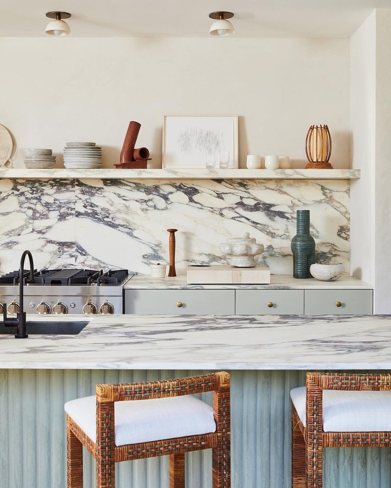 This cook space designed by Athena Calderon, aka @eyeswoon, is probably the one I bookmarked that would most resemble my dream kitchen — complete with Calacutta Monet marble, vintage stools, and Farrow & Ball paint: