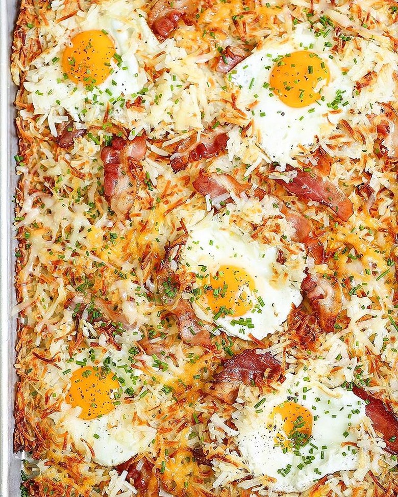 Eggs, bacon, hash browns, and cheese make for a perfect breakfast. Since this recipe uses just a sheet pan, it would be ideal for the morning after a busy holiday.