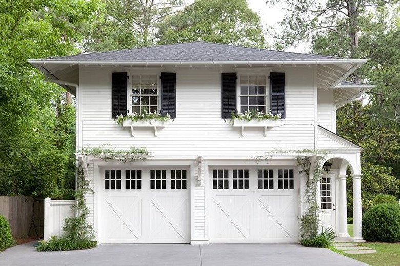Incorporating a little greenery to elevate an exterior is one of our favorite garage door ideas to date. This absolutely dreamy locale from T.S. Adams Studio is a prime example of how effortlessly chic it can be. Hang a trellis along the side — or flank the doors for a more encompassing finish — and allow the lush foliage to frame the carport for a whimsical touch and some serious curb appeal.