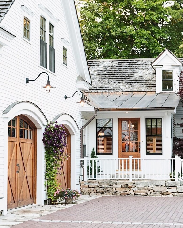 One of the quintessential features of classic carriage house designs is natural wood. While these days most new garage doors are painted to match the home's siding, we can't resist the subtle contrast and rich sense of depth that a warm woodgrain can contribute. Couple that with arched door frames — like the ones seen on this New England estate highlighted on Nicola's Home — and you have a real winner.