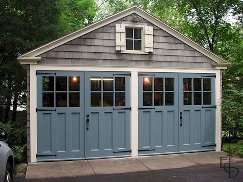 You can't really go wrong with colorful carriage garage doors, especially if the hue is as captivating as the blue shade used in this design by Evergreen Carriage Doors. We're loving the extra-large windows coupled with subtle faceted detailing, hinged doors, and soft gray siding to boot.